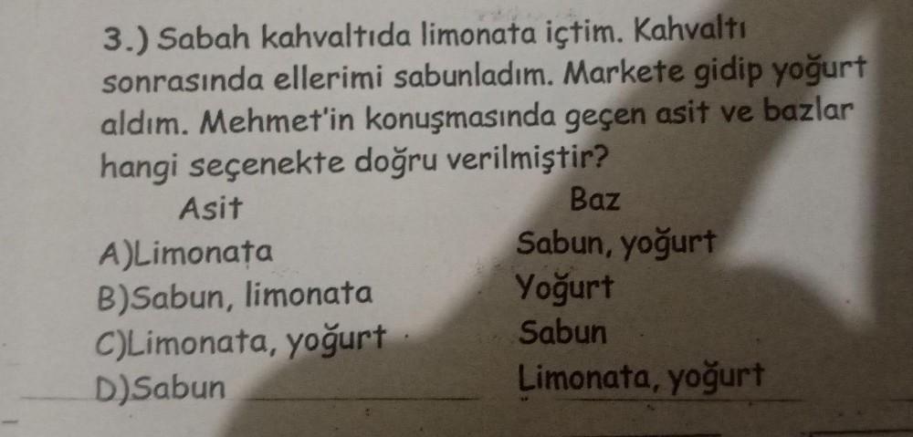 3.) Sabah kahvaltıda limonata içtim. Kahvaltı sonrasında ellerimi sabunladım. Markete gidip yoğurt aldım. Mehmet'in konuşmasında geçen asit ve bazlar hangi seçenekte doğru verilmiştir? Asit A)Limonata B)Sabun, limonata C)Limonata, yoğurt D) Sabun Baz Sabun, yoğurt Yoğurt Sabun Limonata, yoğurt