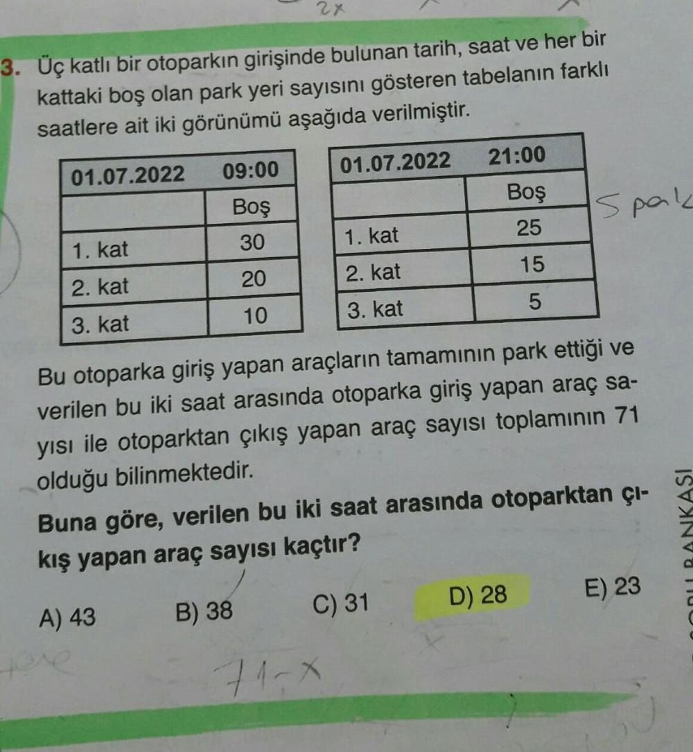 3. Üç katlı bir otoparkın girişinde bulunan tarih, saat ve her bir kattaki boş olan park yeri sayısını gösteren tabelanın farklı saatlere ait iki görünümü aşağıda verilmiştir. 01.07.2022 1. kat 2. kat 3. kat 2x 09:00 Boş 30 20 10 A) 43 yere 01.07.2022 1. kat 2. kat 3. kat Bu otoparka giriş yapan araçların tamamının park ettiği ve verilen bu iki saat arasında otoparka giriş yapan araç sa- yısı ile otoparktan çıkış yapan araç sayısı toplamının 71 olduğu bilinmektedir. 71-X 21:00 Boş 25 15 5 Buna göre, verilen bu iki saat arasında otoparktan çı- kış yapan araç sayısı kaçtır? B) 38 C) 31 Spak D) 28 E) 23