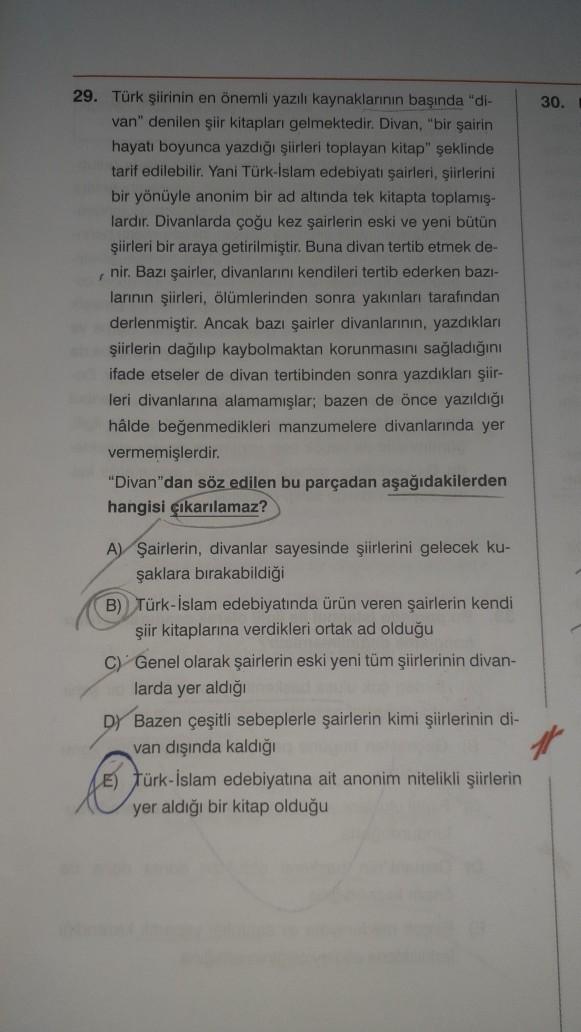 30. 29. Türk şiirinin en önemli yazılı kaynaklarının başında "di- van" denilen şiir kitapları gelmektedir. Divan, "bir şairin hayatı boyunca yazdığı şiirleri toplayan kitap" şeklinde tarif edilebilir. Yani Türk-İslam edebiyatı şairleri, şiirlerini bir yönüyle anonim bir ad altında tek kitapta toplamış- lardir. Divanlarda çoğu kez şairlerin eski ve yeni bütün şiirleri bir araya getirilmiştir. Buna divan tertib etmek de- nir. Bazı şairler, divanlarını kendileri tertib ederken bazı- larının şiirleri, ölümlerinden sonra yakınları tarafından derlenmiştir. Ancak bazı şairler divanlarının, yazdıkları şiirlerin dağılıp kaybolmaktan korunmasını sağladığını ifade etseler de divan tertibinden sonra yazdıkları şiir- leri divanlarına alamamışlar; bazen de önce yazıldığı halde beğenmedikleri manzumelere divanlarında yer vermemişlerdir. "Divan"dan söz edilen bu parçadan aşağıdakilerden hangisi çıkarılamaz? A) Şairlerin, divanlar sayesinde şiirlerini gelecek ku- şaklara bırakabildiği B) Türk-İslam edebiyatında ürün veren şairlerin kendi şiir kitaplarına verdikleri ortak ad olduğu C) Genel olarak şairlerin eski yeni tüm şiirlerinin divan- larda yer aldığ Dy Bazen çeşitli sebeplerle şairlerin kimi şiirlerinin di- van dışında kaldığı E) Türk-İslam edebiyatına ait anonim nitelikli şiirlerin yer aldığı bir kitap olduğu @