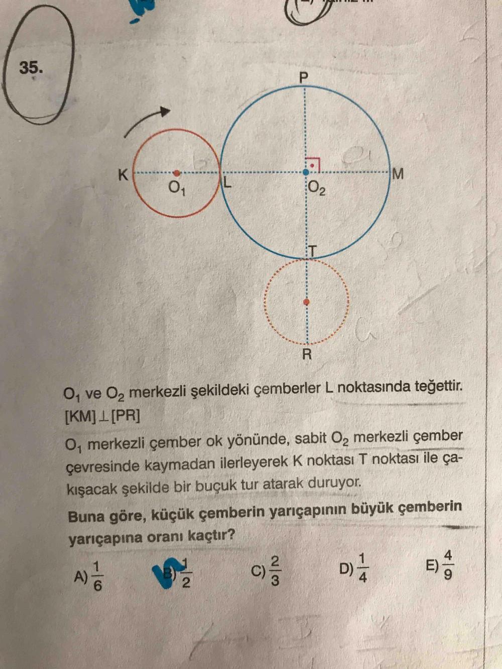 35. K. M 01 L. 02 IT O, ve O, merkezli şekildeki çemberler L noktasında teğettir. [KM]1[PR] O, merkezli çember ok yönünde, sabit O, merkezli çember çevresinde kaymadan ilerleyerek K noktası T noktası ile ça- kışacak şekilde bir buçuk tur atarak duruyo. Buna göre, küçük çemberin yarıçapının büyük çemberin yarıçapına oranı kaçtır? D)- 4 E) C) A) 2 1/4 2/3 1/6