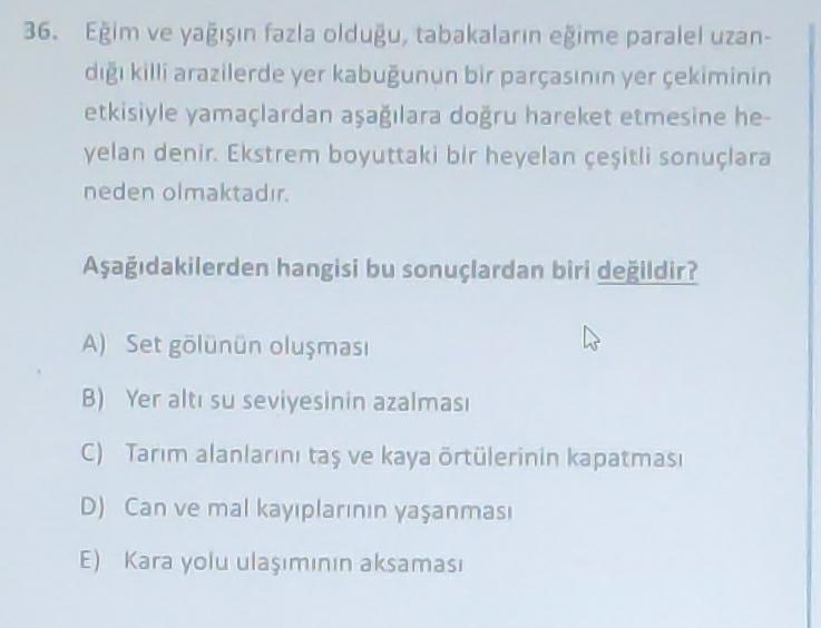 36. Egim ve yağışın fazla oldugu, tabakaların eğime paralel uzan- digi killi arazilerde yer kabuğunun bir parçasının yer çekiminin etkisiyle yamaçlardan aşağılara doğru hareket etmesine he- yelan denir. Ekstrem boyuttaki bir heyelan çeşitli sonuçlara neden olmaktadır. Aşağıdakilerden hangisi bu sonuçlardan biri değildir? A) Set gölunun oluşması B) Yeraltı su seviyesinin azalması C) Tarım alanlarını taş ve kaya örtülerinin kapatması D) Can ve mal kayıplarının yaşanması E) Kara yolu ulaşımının aksaması