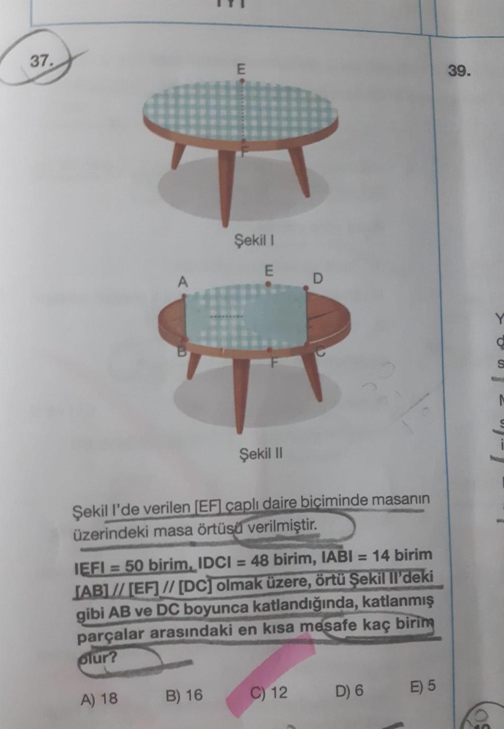 37. 39. Şekil 1 Şekil II Şekil I'de verilen (EF] çaplı daire biciminde masanın üzerindeki masa örtüsü verilmiştir. IEFI = 50 birim. IDCI = 48 birim, IABI = 14 birim JAB]// [EF] // [DCT olmak üzere, örtü Şekil II'deki gibi AB ve DC boyunca katlandığında, katlanmış parçalar arasındaki en kısa mesafe kaç birin plur? A) 18 B) 16 C) 12 D) 6 E) 5