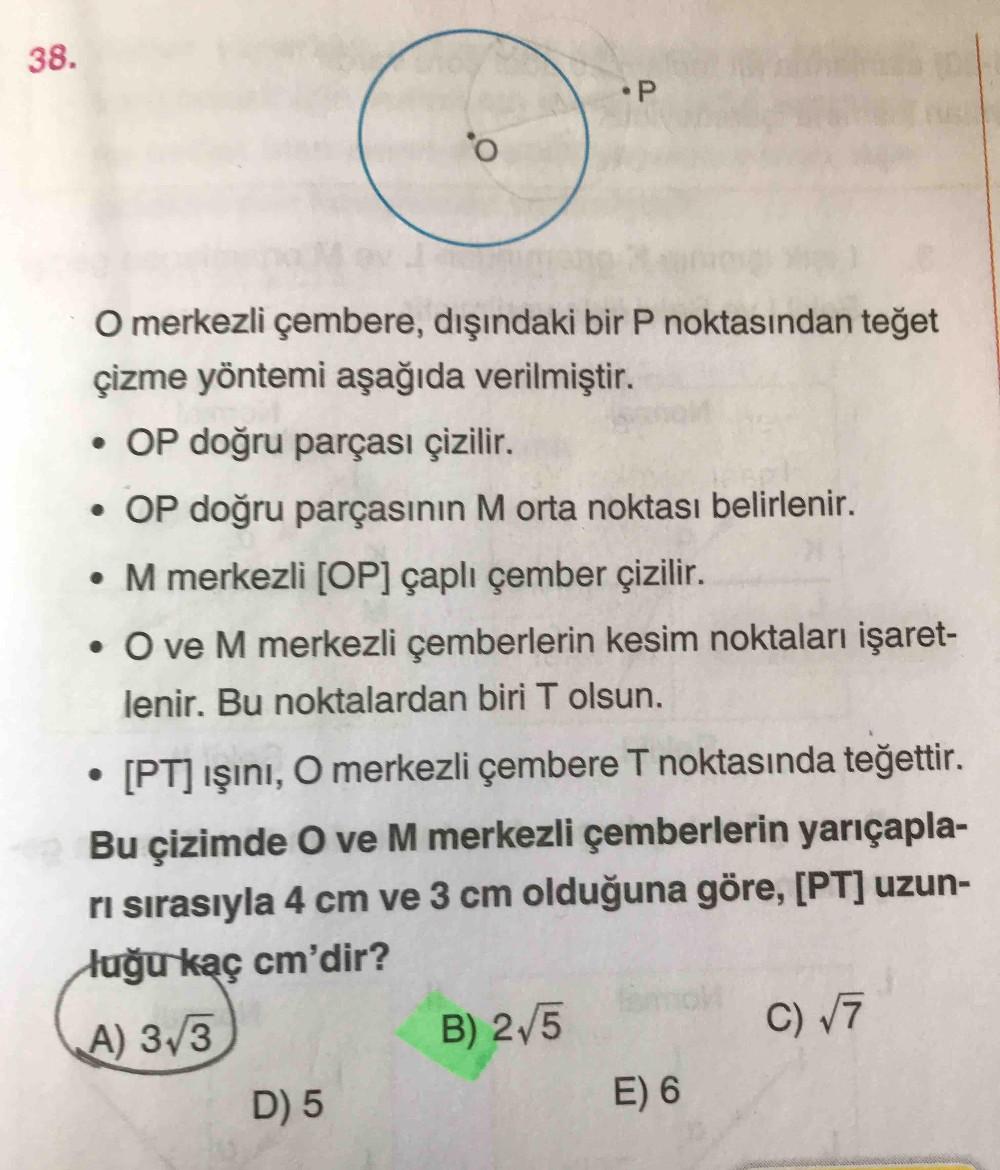 38. o O merkezli çembere, dışındaki bir P noktasından teğet çizme yöntemi aşağıda verilmiştir. • OP doğru parçası çizilir. • OP doğru parçasının Morta noktası belirlenir. • M merkezli [OP] çaplı çember çizilir. • O ve M merkezli çemberlerin kesim noktaları işaret- lenir. Bu noktalardan biri T olsun. • [PT] ışını, O merkezli çembere T noktasında teğettir. Bu çizimde O ve M merkezli çemberlerin yarıçapla- ri sırasıyla 4 cm ve 3 cm olduğuna göre, [PT] uzun- luğu kaç cm'dir? A) 3/3 B) 275 C) 77 D) 5 E) 6