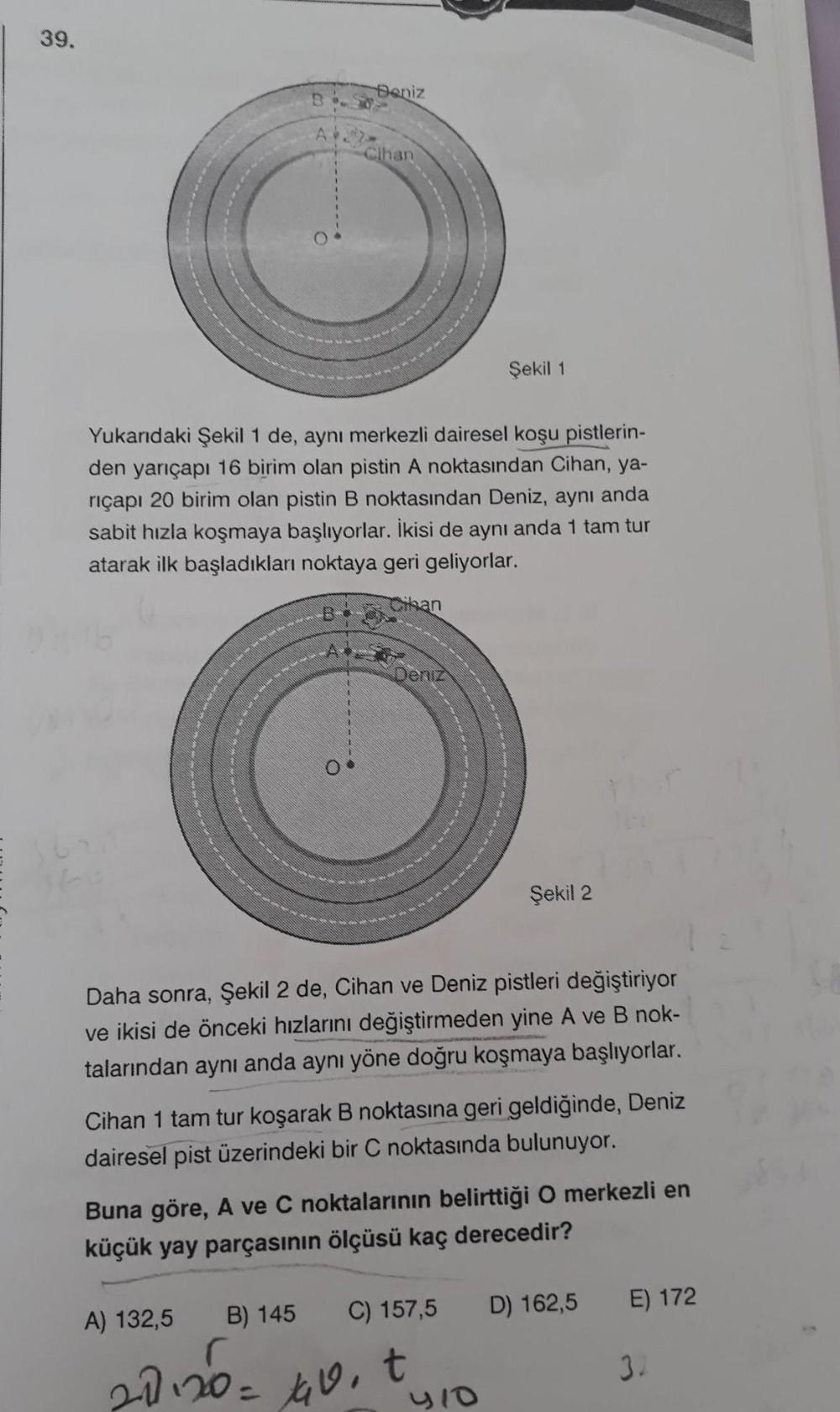 39. Deniz Cihan Şekil 1 Yukarıdaki Şekil 1 de, aynı merkezli dairesel koşu pistlerin- den yarıçapı 16 birim olan pistin A noktasından Cihan, ya- riçapı 20 birim olan pistin B noktasından Deniz, aynı a