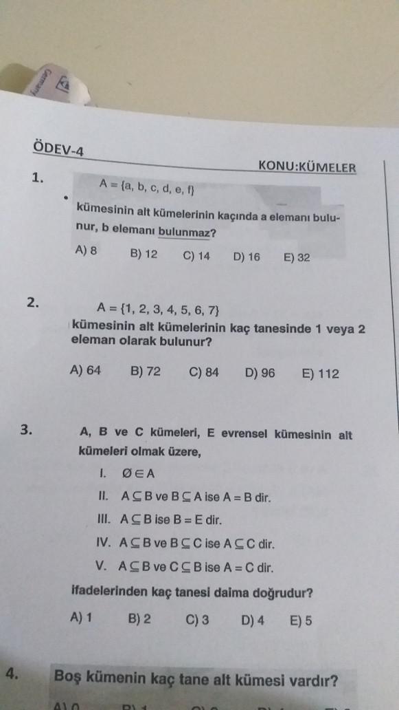 4. 1. ÖDEV-4 2. 3. Germany A = (a, b, c, d, e, f kümesinin alt kümelerinin kaçında a elemanı bulu- nur, b elemanı bulunmaz? A) 8