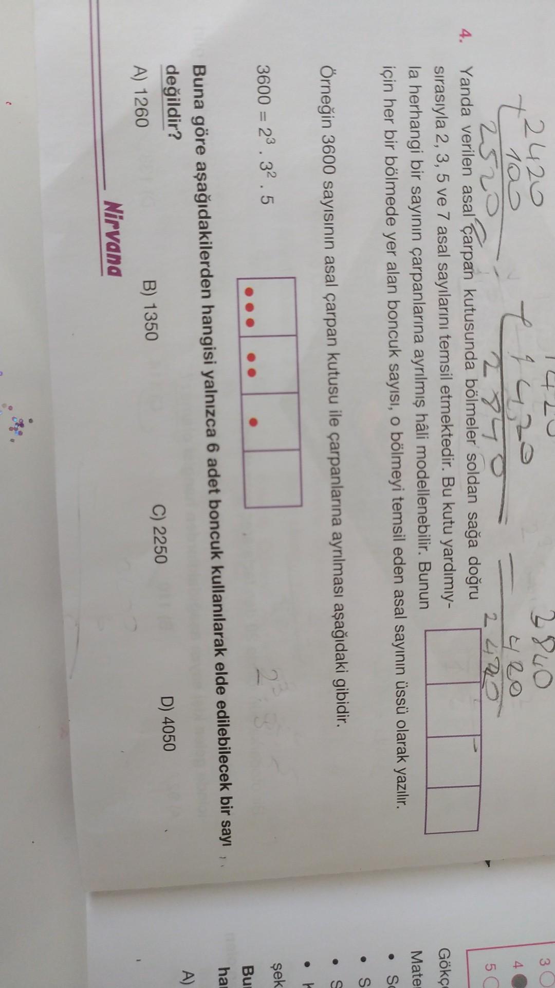 4 5 C 4. 142 2420 2840 ť não e q 420 420 2520 Yanda verilen asal çarpan kutusunda bölmeler soldan sağa doğru 222 sırasıyla 2, 3, 5 ve 7 asal sayılarını temsil etmektedir. Bu kutu yardımıy- la herhangi bir sayının çarpanlarına ayrılmış hâli modellenebilir. Bunun için her bir bölmede yer alan boncuk sayısı, o bölmeyi temsil eden asal sayının üssü olarak yazılır. Gökçe Mate • Sc . S . S Örneğin 3600 sayısının asal çarpan kutusu ile çarpanlarına ayrılması aşağıdaki gibidir. şek 3600 = 23.32.5 Bu hal A) Buna göre aşağıdakilerden hangisi yalnızca 6 adet boncuk kullanılarak elde edilebilecek bir sayı , . değildir? A) 1260 B) 1350 C) 2250 D) 4050 Nirvana