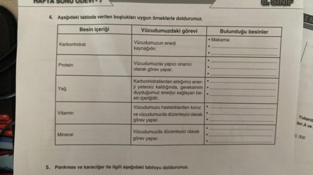 4. Aşağıdaki tabloda verilen boşlukları uygun örneklerle doldurunuz. Besin içeriği Vücudumuzdaki görevi Karbonhidrat Protein Yağ Vitamin Mineral Vücudumuzun enerji kaynağıdır. Vücudumuzda yapıcı onarıcı olarak görev yapar. Karbonhidratlardan aldığımız ener- ji yetersiz kaldığında, gereksinim duyduğumuz enerjiyi sağlayan be- sin içeriğidir. Vücudumuzu hastalıklardan korur ve vücudumuzda düzenleyici olarak görev yapar. Vücudumuzda düzenleyici olarak görev yapar. 5. Pankreas ve karaciğer ile ilgili aşağıdaki tabloyu doldurunuz. • Makarna . 6. SINIF Bulunduğu besinler EN Yukarıd len A ve \) 300