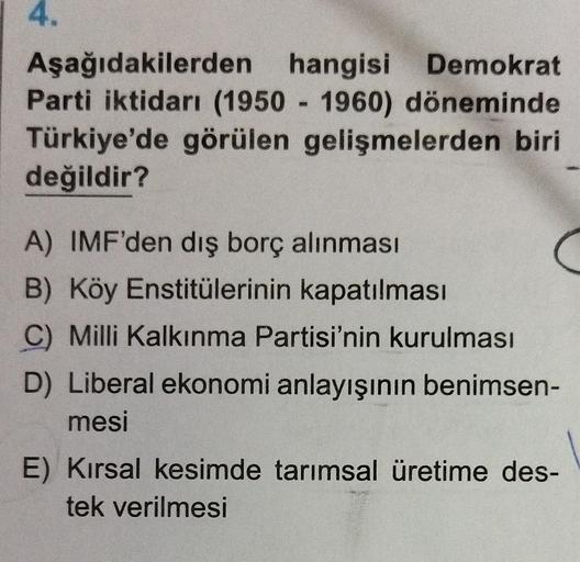 4. Aşağıdakilerden hangisi hangisi Demokrat Parti iktidarı (1950 - 1960) döneminde Türkiye'de görülen gelişmelerden biri değildir? A) IMF'den dış borç alınması B) Köy Enstitülerinin kapatılması C) Milli Kalkınma Partisi'nin kurulması D) Liberal ekonomi anlayışının benimsen- mesi E) Kırsal kesimde tarımsal üretime des- tek verilmesi