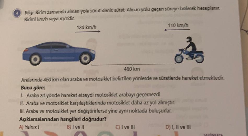 4 Bilgi: Birim zamanda alınan yola sürat denir. sürat; Alinan yolu geçen süreye bölerek hesaplanır. Birimi km/h veya m/s'dir. 120 km/h 110 km/h 460 km Aralarında 460 km olan araba ve motosiklet belirtilen yönlerde ve süratlerde hareket etmektedir. Buna göre, I. Araba zıt yönde hareket etseydi motosiklet arabayı geçemezdi II. Araba ve motosiklet karşılaştıklarında motosiklet daha az yol almıştır. III. Araba ve motosiklet yer değiştirirlerse yine aynı noktada buluşurlar. Açıklamalarından hangileri doğrudur? A) Yalnız I B) I ve II C) I ve III D) I, II ve III SAHİNKAYA