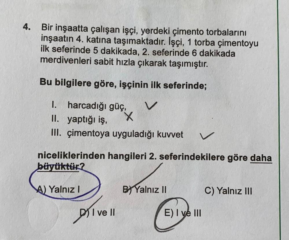 4. Bir inşaatta çalışan işçi, yerdeki çimento torbalarını inşaatın 4. katına taşımaktadır. İşçi, 1 torba çimentoyu ilk seferinde 5 dakikada, 2. seferinde 6 dakikada merdivenleri sabit hızla çıkarak taşımıştır. Bu bilgilere göre, işçinin ilk seferinde; 1. harcadığı güç, V II. yaptığı iş, X III. çimentoya uyguladığı kuvvet niceliklerinden hangileri 2. seferindekilere göre daha büyüktür? A) Yalnız! B) Yalnız II C) Yalnız III DI ve II E) I ve III