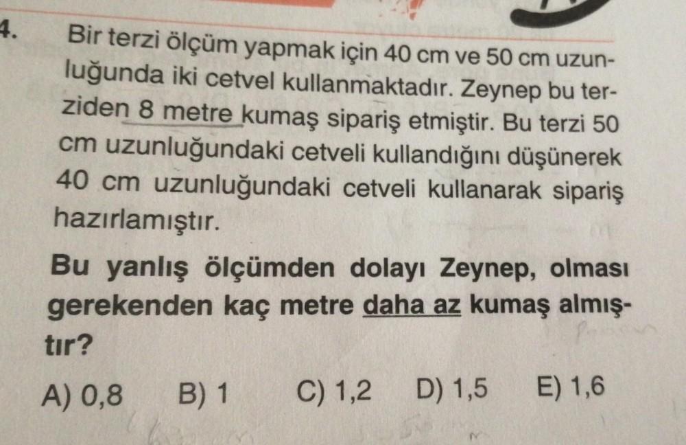 4. Bir terzi ölçüm yapmak için 40 cm ve 50 cm uzun- luğunda iki cetvel kullanmaktadır. Zeynep bu ter- ziden 8 metre kumaş sipariş etmiştir. Bu terzi 50 cm uzunluğundaki cetveli kullandığını düşünerek 40 cm uzunluğundaki cetveli kullanarak sipariş hazırlamıştır. Bu yanlış ölçümden dolayı Zeynep, olması gerekenden kaç metre daha az kumaş almış. tır? A) 0,8 B) 1 C) 1,2 D) 1,5 E) 1,6