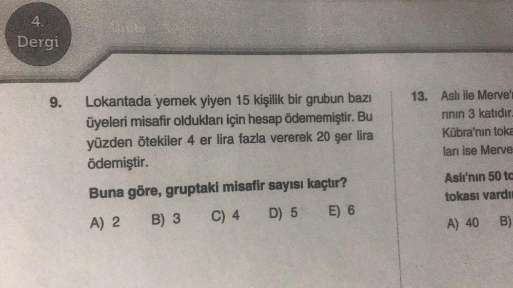 4. Dergi 9. Lokantada yemek yiyen 15 kişilik bir grubun bazı üyeleri misafir oldukları için hesap ödememiştir. Bu yüzden ötekiler 4 er lira fazla vererek 20 şer lira ödemiştir. 13. Aslı ile Merve' rinin 3 katıdır. Kübra'nın toka lan ise Merve Buna göre, gruptaki misafir sayısı kaçtır? Aslı'nın 50 to tokası vardı B) 3 E) 6 D) 5 C) 4 A) 2 A) 40 B)