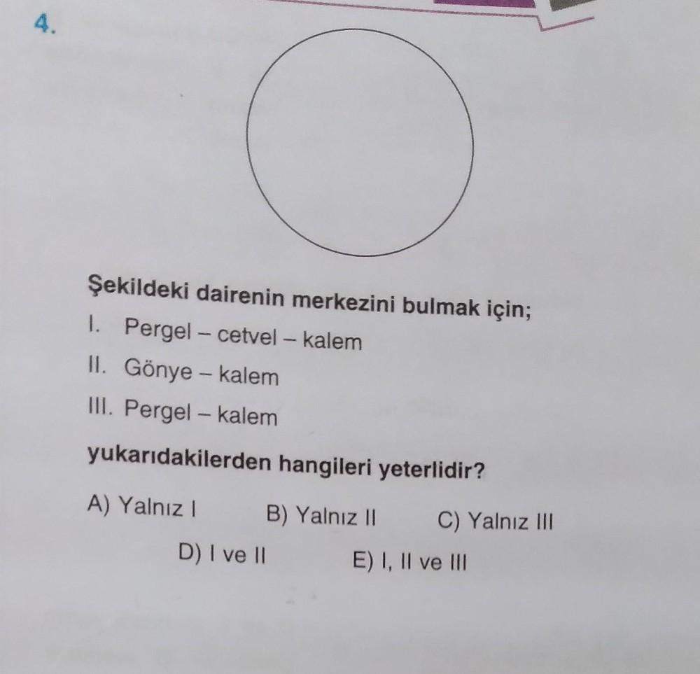 4. Şekildeki dairenin merkezini bulmak için; 1. Pergel - cetvel - kalem II. Gönye - kalem III. Pergel - kalem yukarıdakilerden hangileri yeterlidir? A) Yalnız I B) Yalnız II D) I ve II C) Yalnız III E) I, II ve III