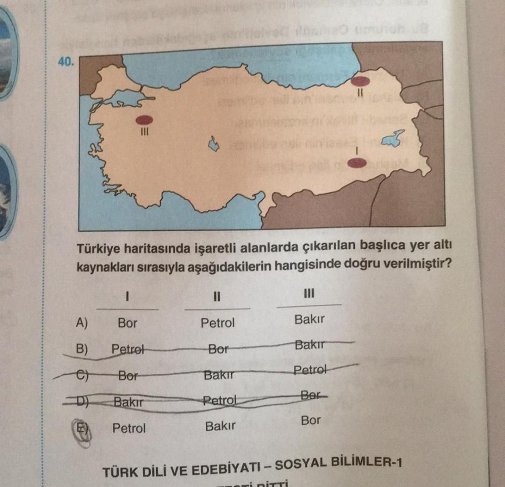 40. Türkiye haritasında işaretli alanlarda çıkarılan başlıca yer altı kaynakları sırasıyla aşağıdakilerin hangisinde doğru verilmiştir? III Bakır Bakır Petrol Ber Bor I A) Bor B) e) Petrol Bor Bakır Petrol NISEM Petrol Bor Bakır Petrol Bakır TÜRK DİLİ VE EDEBİYATI - SOSYAL BİLİMLER-1 eri DİTTİ