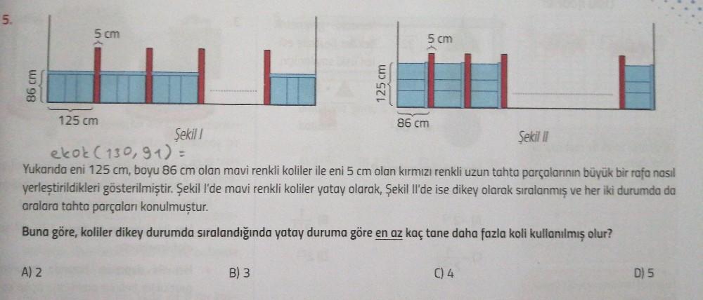 5. 5 cm 5 cm cm 125 cm 125 cm 86 cm Şekil / Sekil ekok (130,91) = Yukarıda eni 125 cm, boyu 86 cm olan mavi renkli koliler ile eni 5 cm olan kırmızı renkli uzun tahta parçalarının büyük bir rafa nasıl yerleştirildikleri gösterilmiştir. Şekill'de mavi renkli koliler yatay olarak, Şekil Il'de ise dikey olarak sıralanmış ve her iki durumda da aralara tahta parçaları konulmuştur. Buna göre, koliler dikey durumda sıralandığında yatay duruma göre en az kaç tane daha fazla koli kullanılmış olur? A) 2 B) 3 C) 4 D) 5