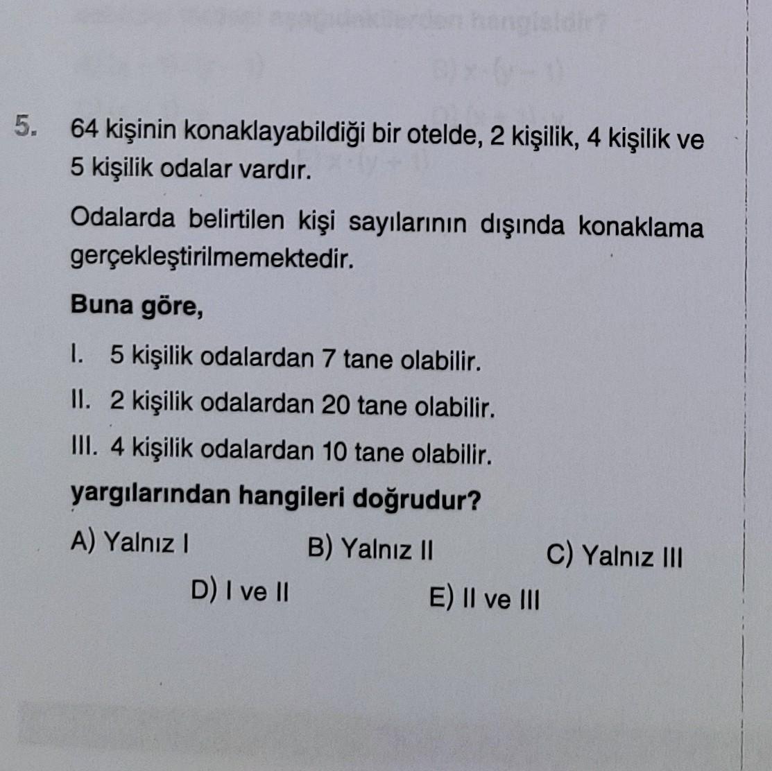 5. 64 kişinin konaklayabildiği bir otelde, 2 kişilik, 4 kişilik ve 5 kişilik odalar vardır. Odalarda belirtilen kişi sayılarının dışında konaklama gerçekleştirilmemektedir. Buna göre, I. 5 kişilik odalardan 7 tane olabilir. II. 2 kişilik odalardan 20 tane olabilir. III. 4 kişilik odalardan 10 tane olabilir. yargılarından hangileri doğrudur? A) Yalnız B) Yalnız II C) Yalnız III D) I ve II E) II ve III