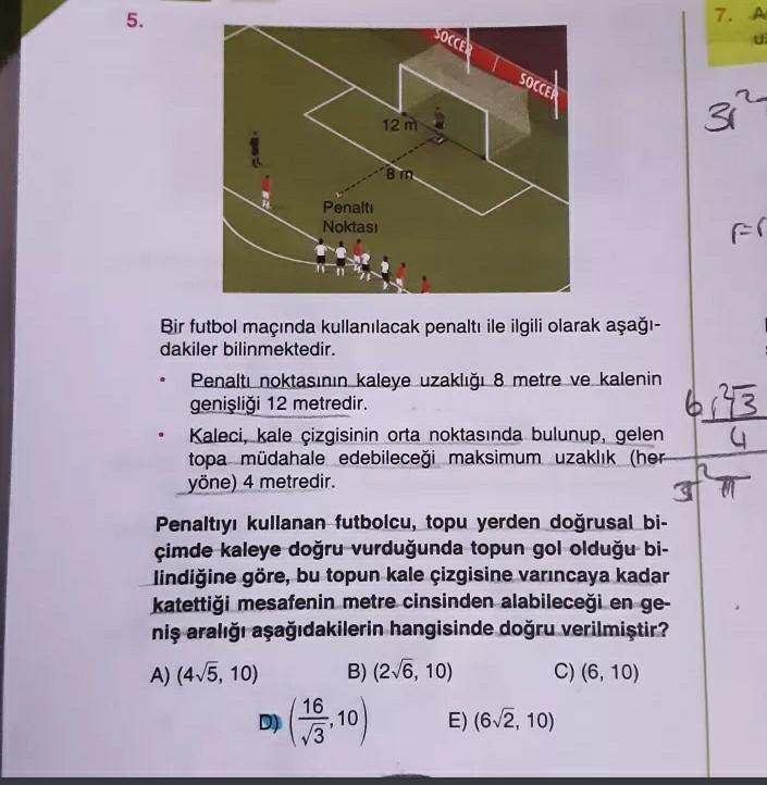 5. 7. A SOCCER SOCCER 12 m Penalti Noktası 4 Bir futbol maçında kullanılacak penaltı ile ilgili olarak aşağı- dakiler bilinmektedir. Penaltı noktasının kaleye uzaklığı 8 metre ve kalenin genişliği 12 metredir. Kaleci, kale çizgisinin orta noktasında bulunup, gelen topa müdahale edebileceği maksimum uzaklık (her yöne) 4 metredir. Penaltıyı kullanan futbolcu, topu yerden doğrusal bi- çimde kaleye doğru vurduğunda topun gol olduğu bi- lindiğine göre, bu topun kale çizgisine varıncaya kadar katettiği mesafenin metre cinsinden alabileceği en ge- niş aralığı aşağıdakilerin hangisinde doğru verilmiştir? A) (4/5, 10) B) (2/6, 10) C) (6, 10) 16 D) 10 E) (6/2, 10) 3 1