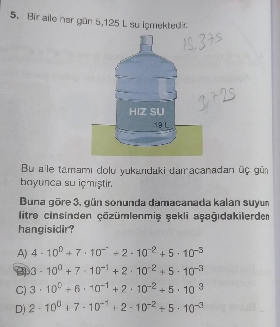 5. Bir aile her gün 5,125 L su içmektedir. 15,375 3,725 HIZ SU 19 L Bu aile tamamı dolu yukarıdaki damacanadan üç gün boyunca su içmiştir. Buna göre 3. gün sonunda damacanada kalan suyun litre cinsinden çözümlenmiş şekli aşağıdakilerden hangisidir? . . A) 4 . 10° + 7 . 10-1 + 2 . 10-2 + 5 . 10-3 3) 3 . 10° + 7. 10-1+2 . 10-2 +5 . 10-3 C) 3. 10° +6.10-1 + 2 . 10-2 +5 . 10-3 D) 2. 10° +7.10-1 + 2 . 10-2 +5 . 10-3