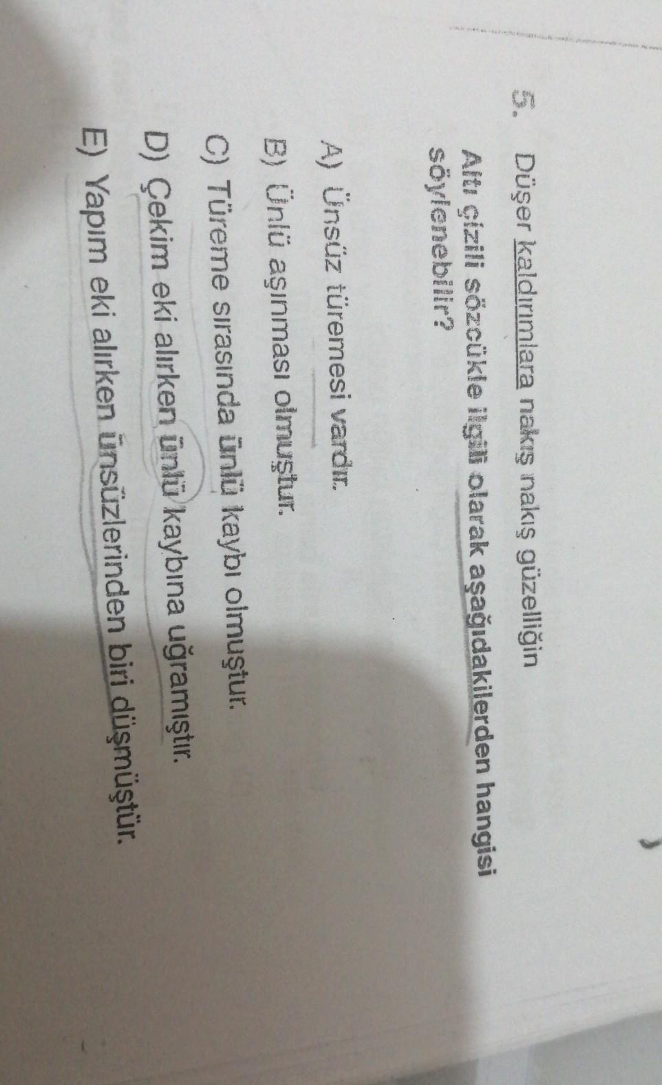 5. Düşer kaldırımlara nakış nakış güzelliğin Altı çizili sözcükle ilgili olarak aşağıdakilerden hangisi söylenebilir? A) Ünsüz türemesi vardır. B) Ünlü aşınması olmuştur. C) Türeme sırasında ünlü kaybı olmuştur. D) Çekim eki alırken ünlü kaybına uğramıştır. E) Yapım eki alırken ünsüzlerinden biri düşmüştür.