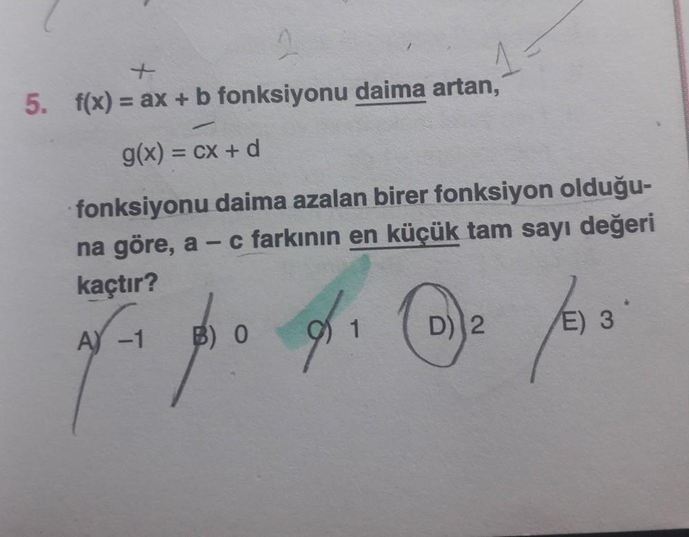5. f(x) = ax +b fonksiyonu daima artan, %3D g(x)% 3 cx + d fonksiyonu daima azalan birer fonksiyon olduğu- na göre, a - c farkının en küçük tam sayı değeri kaçtır? AY-1 B) O 1 D) 2 E) 3