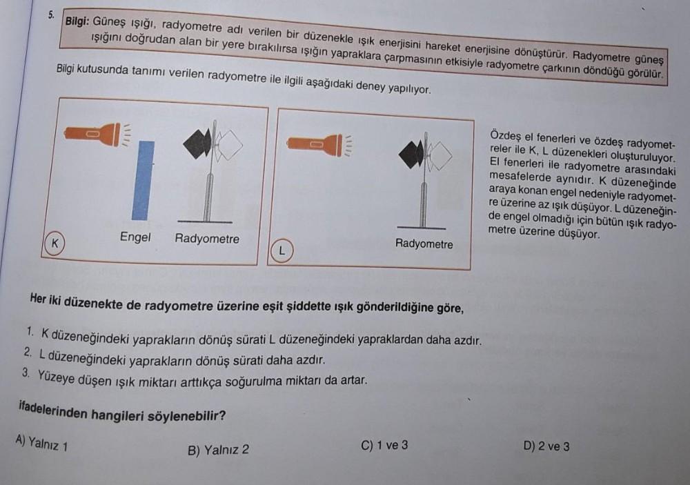 5. K Bilgi: Güneş ışığı, radyometre adı verilen bir düzenekle ışık enerjisini hareket enerjisine dönüştürür. Radyometre güneş ışığını doğrudan alan bir yere bırakılırsa ışığın yapraklara çarpmasının etkisiyle radyometre çarkının döndüğü görülür. Bilgi kutusunda tanımı verilen radyometre ile ilgili aşağıdaki deney yapılıyor. Engel A) Yalnız 1 Radyometre 1 Her iki düzenekte de radyometre üzerine eşit şiddette ışık gönderildiğine göre, 1. K düzeneğindeki yaprakların dönüş sürati L düzeneğindeki yapraklardan daha azdır. 2. L düzeneğindeki yaprakların dönüş sürati daha azdır. 3. Yüzeye düşen ışık miktarı arttıkça soğurulma miktarı da artar. ifadelerinden hangileri söylenebilir? B) Yalnız 2 Radyometre C) 1 ve 3 Özdeş el fenerleri ve özdeş radyomet- reler ile K, L düzenekleri oluşturuluyor. El fenerleri ile radyometre arasındaki mesafelerde aynıdır. K düzeneğinde araya konan engel nedeniyle radyomet- re üzerine az ışık düşüyor. L düzeneğin- de engel olmadığı için bütün ışık radyo- metre üzerine düşüyor. D) 2 ve 3