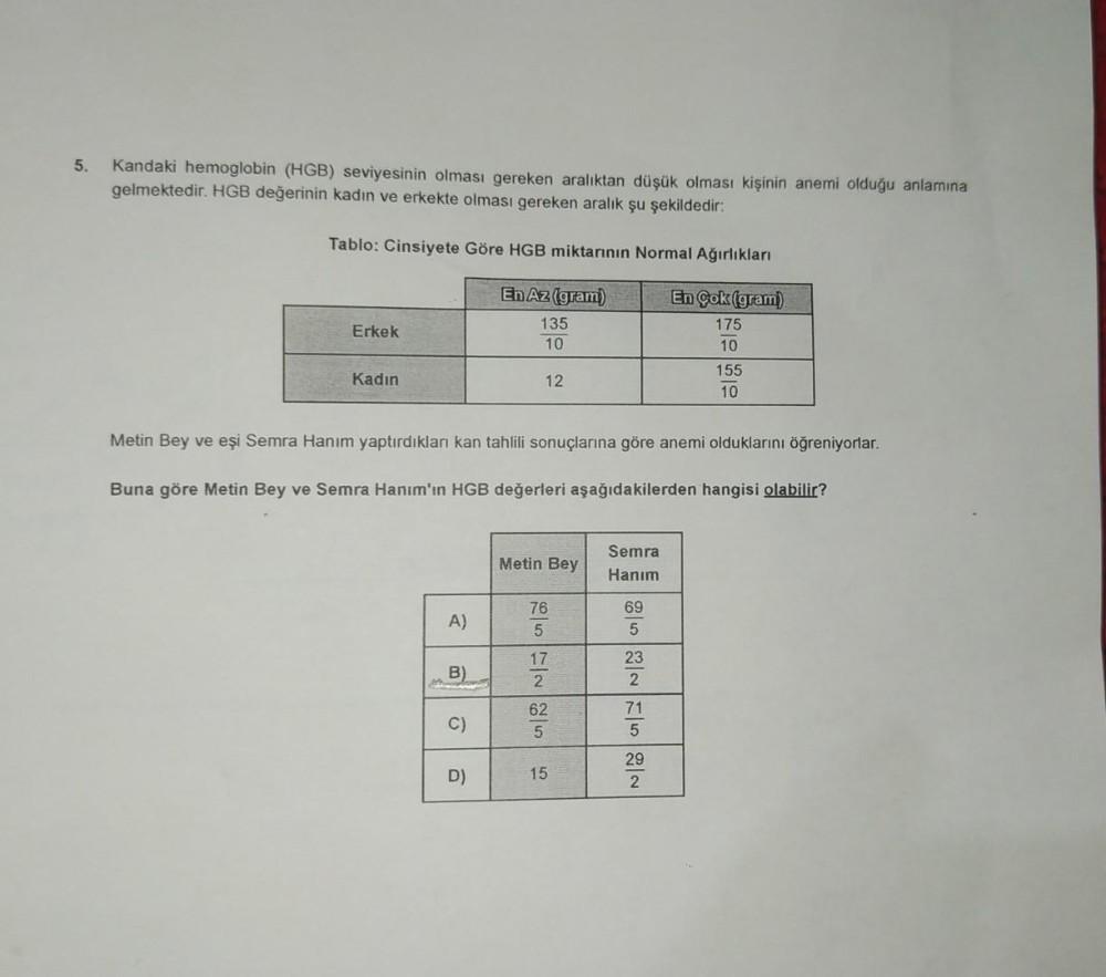 5. Kandaki hemoglobin (HGB) seviyesinin olması gereken aralıktan düşük olması kişinin anemi olduğu anlamına gelmektedir. HGB değerinin kadın ve erkekte olması gereken aralık şu şekildedir: Tablo: Cinsiyete Göre HGB miktarının Normal Ağırlıkları En Az (gram) En Çok (gram) 135 175 10 10 Erkek Kadın A) Metin Bey ve eşi Semra Hanım yaptırdıkları kan tahlili sonuçlarına göre anemi olduklarını öğreniyorlar. Buna göre Metin Bey ve Semra Hanım'ın HGB değerleri aşağıdakilerden hangisi olabilir? B) Hondens C) 12 D) Metin Bey 76 5 17 2 62 5 15 Semra Hanım 69 5 23 2 71 5 155 10 29 2