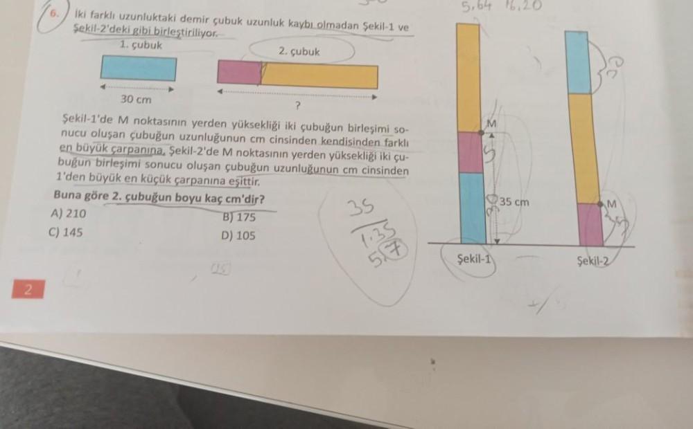5,64 16,20 Iki farkli uzunluktaki demir çubuk uzunluk kaybı olmadan Şekil 1 ve Şekil-2'deki gibi birleştiriliyor. 1. çubuk 2. çubuk M 4 30 cm ? Şekil 1'de M noktasının yerden yüksekliği iki çubuğun birleşimi so- nucu oluşan çubuğun uzunluğunun cm cinsinden kendisinden farklı en büyük çarpanina, Şekil-2'de M noktasının yerden yüksekliği iki çu- buğun birleşimi sonucu oluşan çubuğun uzunluğunun cm cinsinden 1'den büyük en küçük çarpanına eşittir. Buna göre 2. çubuğun boyu kaç cm'dir? A) 210 B) 175 C) 145 D) 105 $35 cm 35 7:35 Şekil-1 5.7 Şekil-2 2