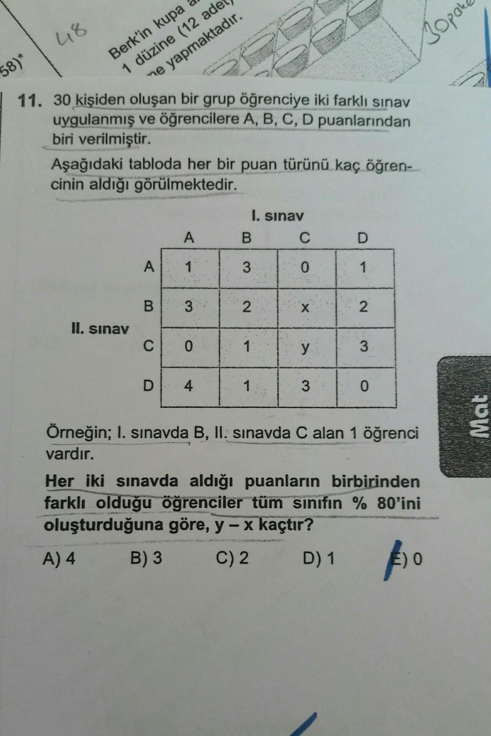 58)* 48 Berk'in kupa 1 düzine (12 ade ne yapmaktadır. 11. 30 kişiden oluşan bir grup öğrenciye iki farklı sınav uygulanmış ve öğrencilere A, B, C, D puanlarından biri verilmiştir. Aşağıdaki tabloda her bir puan türünü kaç öğren- cinin aldığı görülmektedir. II. sınav A B A 1₁ 3 C 0 D 4 B) 3 I. sınav B 3 2 1 1. C 0 X y 3 D 1. 2 3 Bopak 0 Örneğin; I. sınavda B, II. sınavda C alan 1 öğrenci vardır. Her iki sınavda aldığı puanların birbirinden farklı olduğu öğrenciler tüm sınıfın % 80'ini oluşturduğuna göre, y - x kaçtır? A) 4 C) 2 D) 1 E) 0 Mat