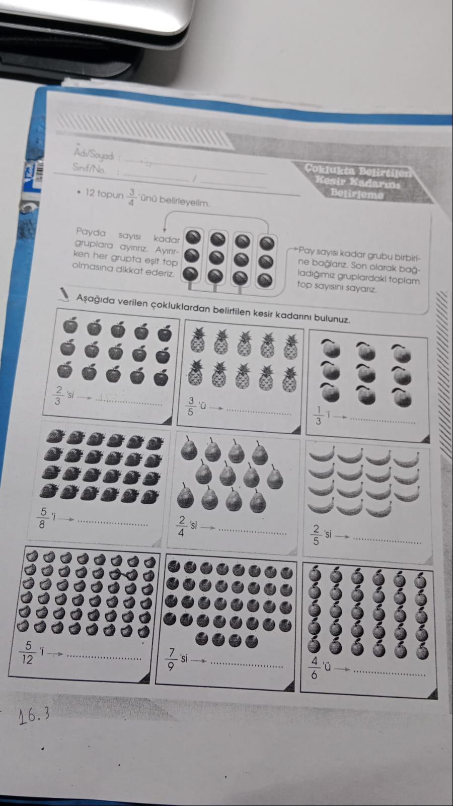 58 'i 12 16.3 23 'i Adi/Soyadı Sinif/No 'si ↑ • 12 topun 'ünü belirleyelim. Payda sayısı kadar gruplara ayınınız. Ayinr- ken her