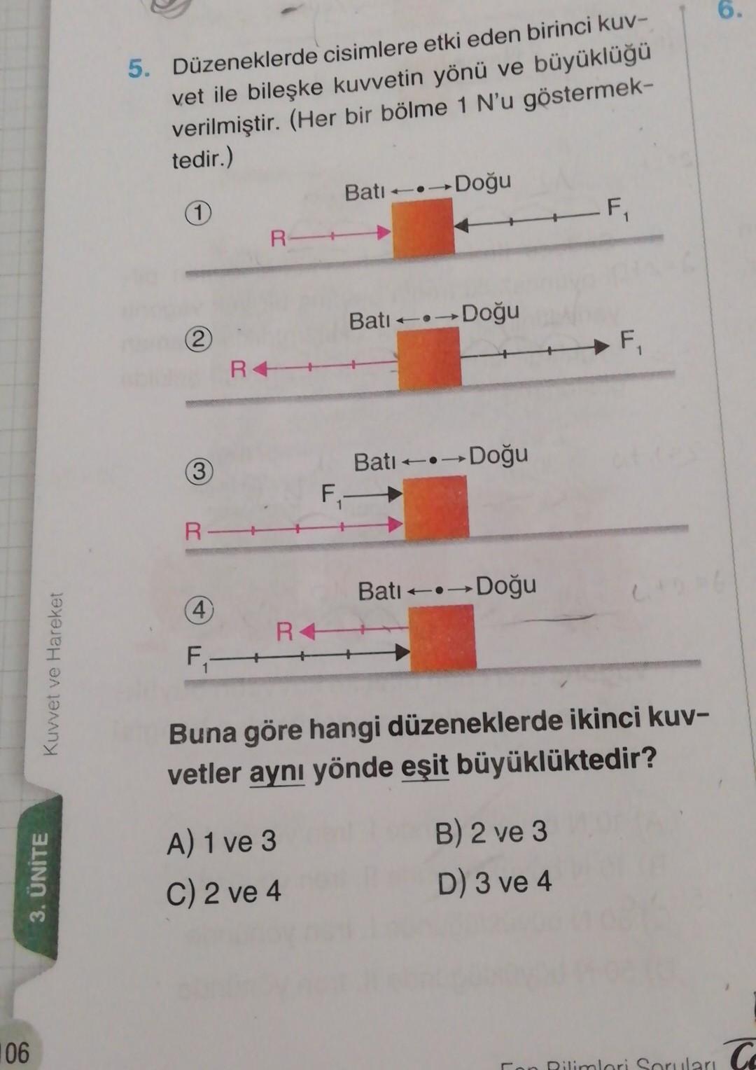 6. 5. Düzeneklerde cisimlere etki eden birinci kuv- vet ile bileşke kuvvetin yönü ve büyüklüğü verilmiştir. (Her bir bölme 1 N'u göstermek- tedir.) Batı. Doğu (1 -F R Bati. Doğu F 2 R++ 3 Bati.-Doğu F,- R JU Bati-.--Doğu Kuvvet ve Hareket 4 RH F-4 Buna göre hangi düzeneklerde ikinci kuv- vetler aynı yönde eşit büyüklüktedir? A) 1 ve 3 3. ÜNİTE B) 2 ve 3 D) 3 ve 4 C) 2 ve 4 106 To en Bilimleri Soruları