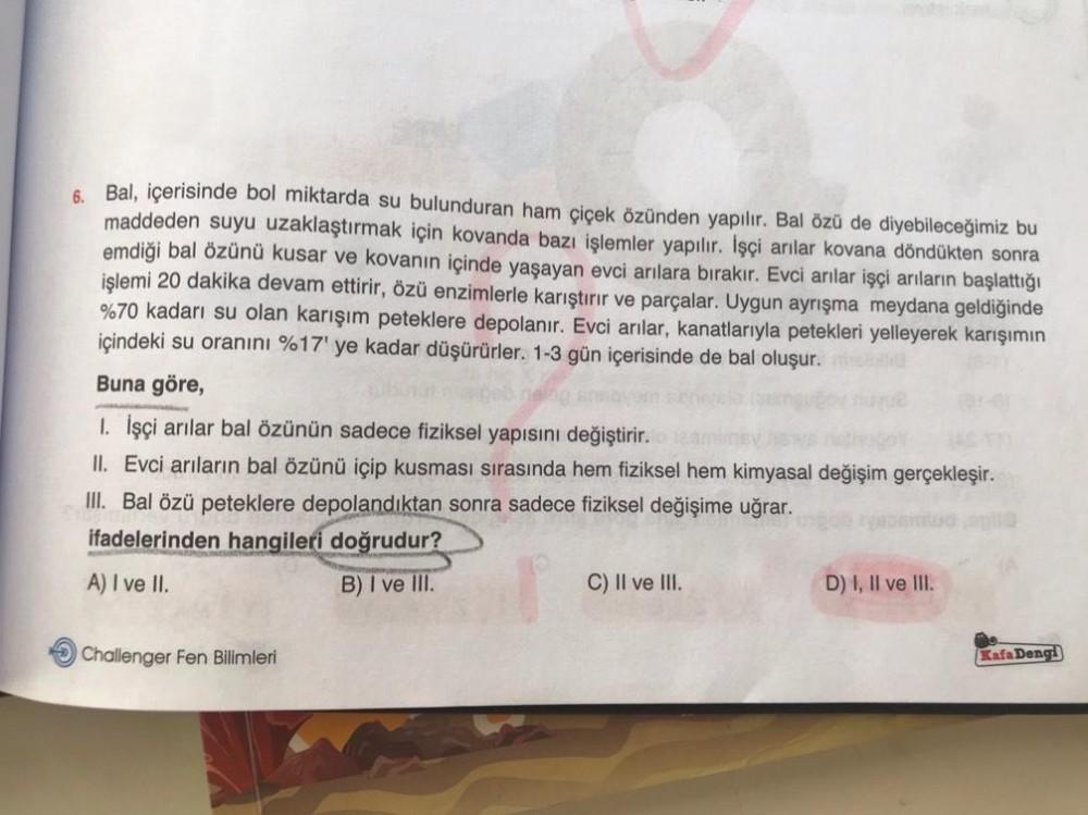 6. Bal, içerisinde bol miktarda su bulunduran ham çiçek özünden yapılır. Bal özü de diyebileceğimiz bu maddeden suyu uzaklaştırmak için kovanda bazı işlemler yapılır. İşçi arılar kovana döndükten sonra emdiği bal özünü kusar ve kovanın içinde yaşayan evci arılara bırakır. Evci arılar işçi arıların başlattığı işlemi 20 dakika devam ettirir, özü enzimlerle karıştırır ve parçalar. Uygun ayrışma meydana geldiğinde %70 kadarı su olan karışım peteklere depolanır. Evci arılar, kanatlarıyla petekleri yelleyerek karışımın içindeki su oranını %17' ye kadar düşürürler. 1-3 gün içerisinde de bal oluşur. Buna göre, 1. İşçi arılar bal özünün sadece fiziksel yapısını değiştirir. II. Evci arıların bal özünü içip kusması sırasında hem fiziksel hem kimyasal değişim gerçekleşir. III. Bal özü peteklere depolandıktan sonra sadece fiziksel değişime uğrar. ifadelerinden hangileri doğrudur? A) I ve II. B) I ve III. Challenger Fen Bilimleri C) II ve III. D) I, II ve III. Kafa Dengi