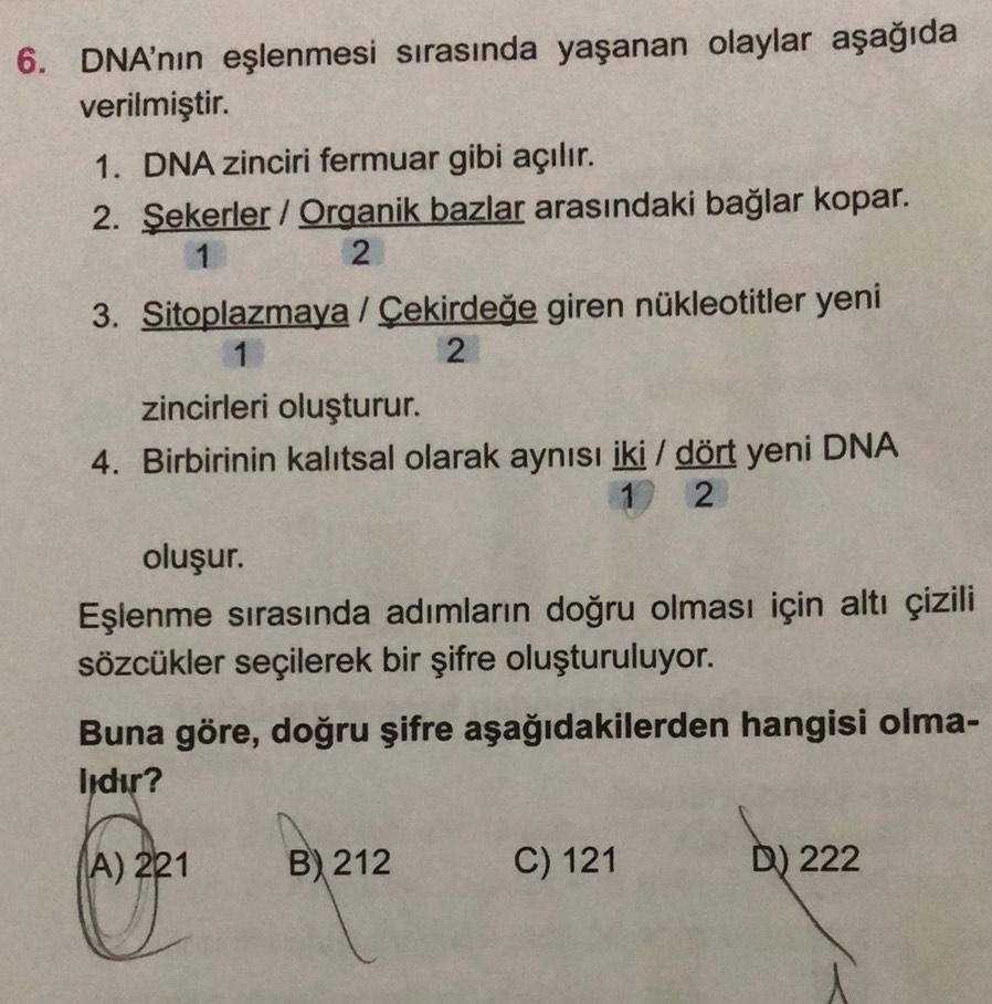 6. DNA'nın eşlenmesi sırasında yaşanan olaylar aşağıda verilmiştir. 1. DNA zinciri fermuar gibi açılır. 2. Şekerler/Organik bazlar arasındaki bağlar kopar. 1 2 3. Sitoplazmaya / Çekirdeğe giren nükleotitler yeni 1 2 zincirleri oluşturur. 4. Birbirinin kalıtsal olarak aynısı iki / dört yeni DNA 1 2 oluşur. Eşlenme sırasında adımların doğru olması için altı çizili sözcükler seçilerek bir şifre oluşturuluyor. Buna göre, doğru şifre aşağıdakilerden hangisi olma- lıdır? (A) 221 B) 212 C) 121 D) 222