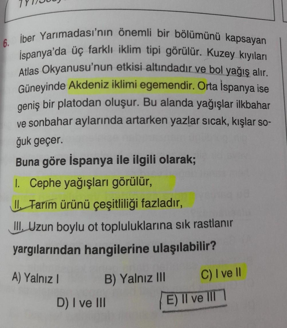 6. İber Yarımadası'nın önemli bir bölümünü kapsayan İspanya'da üç farklı iklim tipi görülür. Kuzey kıyıları Atlas Okyanusu'nun etkisi altındadır ve bol yağış alır. Güneyinde Akdeniz iklimi egemendir. Orta İspanya ise geniş bir platodan oluşur. Bu alanda yağışlar ilkbahar ve sonbahar aylarında artarken yazlar sıcak, kışlar so- ğuk geçer. Buna göre İspanya ile ilgili olarak; 1. Cephe yağışları görülür, II, Tarım ürünü çeşitliliği fazladır, III. Uzun boylu ot topluluklarına sık rastlanır yargılarından hangilerine ulaşılabilir? A) Yalnız B) Yalnız III C) I ve II E) Il ve III D) I ve III