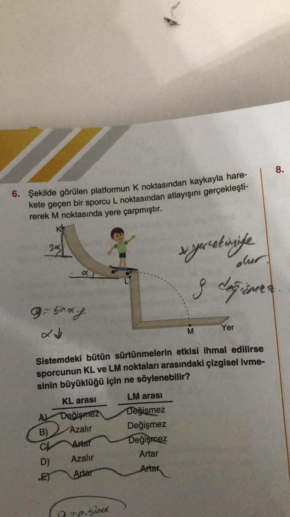 6. Şekilde görülen platformun K noktasından kaykayla hare- kete geçen bir sporcu L noktasından atlayışını gerçekleşti- rerek M noktasında yere çarpmıştır. g=sinxy A B) D) Sistemdeki bütün sürtünmelerin etkisi ihmal edilirse sporcunun KL ve LM noktaları arasındaki çizgisel ivme- sinin büyüklüğü için ne söylenebilir? LM arası Değişmez Değişmez Değişmez Artar Artak KL arası Değişmez Azalır Artar Azalır Artar dur. x yerçetimiyle 8 değiomed =p. Sind M Yer 8.