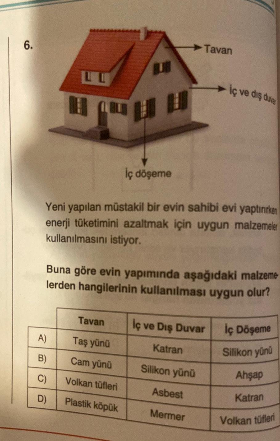 6. Tavan iç ve dış dur iç döşeme Yeni yapılan müstakil bir evin sahibi evi yaptırırken enerji tüketimini azaltmak için uygun malzemeler kullanılmasını istiyor. Buna göre evin yapımında aşağıdaki malzeme lerden hangilerinin kullanılması uygun olur? Tavan İç ve Dış Duvar Iç Döşeme A) Taş yünü Katran Silikon yunu B) Cam yünü Silikon yünü C) Volkan tüfleri Ahşap Asbest D) Plastik köpük Katran Mermer Volkan tüfleri