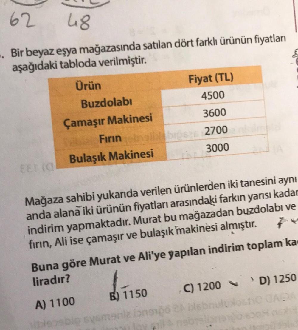 62 48 .. Bir beyaz eşya mağazasında satılan dört farklı ürünün fiyatları aşağıdaki tabloda verilmiştir. Ürün EET (O Buzdolabı Çamaşır Makinesi Fırın Bulaşık Makinesi Fiyat (TL) 4500 3600 2700 3000 bisz Mağaza sahibi yukarıda verilen ürünlerden iki tanesini aynı anda alana iki ürünün fiyatları arasındaki farkın yarısı kadan indirim yapmaktadır. Murat bu mağazadan buzdolabı ve fırın, Ali ise çamaşır ve bulaşık makinesi almıştır. B1150 Buna göre Murat ve Ali'ye yapılan indirim toplam ka liradır? A) 1100 C) 1200 pitlesbip syemenic langpo 24 bisbrulu pill+ nabrali D) 1250 NO QAQA