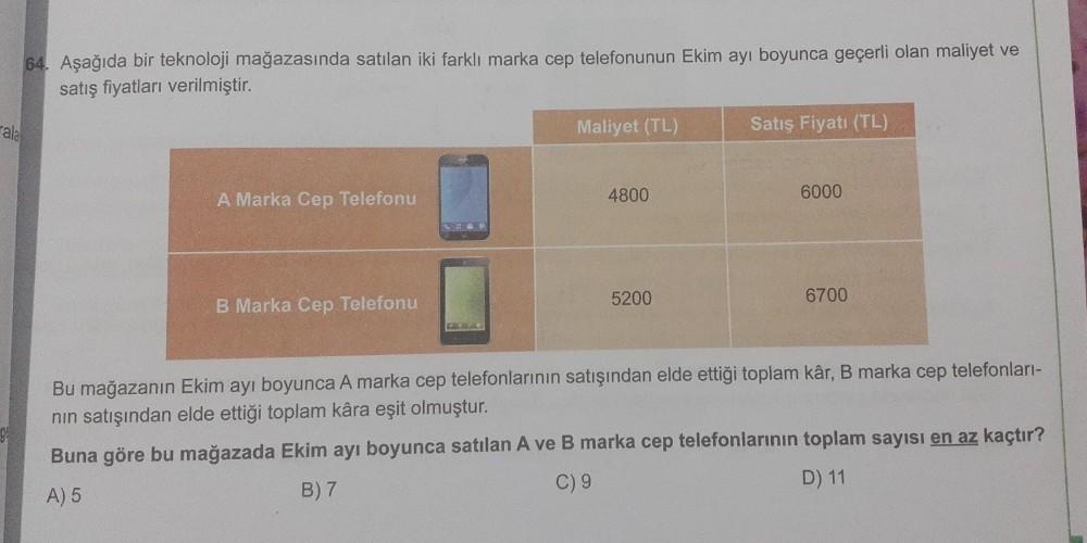 64. Aşağıda bir teknoloji mağazasında satılan iki farklı marka cep telefonunun Ekim ayı boyunca geçerli olan maliyet ve satış fiyatları verilmiştir. ala Maliyet (TL) Satış Fiyatı (TL) A Marka Cep Telefonu 4800 6000 5200 6700 B Marka Cep Telefonu Bu mağazanın Ekim ayı boyunca A marka cep telefonlarının satışından elde ettiği toplam kâr, B marka cep telefonlari- nin satışından elde ettiği toplam kâra eşit olmuştur. Buna göre bu mağazada Ekim ayı boyunca satılan A ve B marka cep telefonlarının toplam sayısı en az kaçtır? A) 5 B) 7 D) 11 C) 9