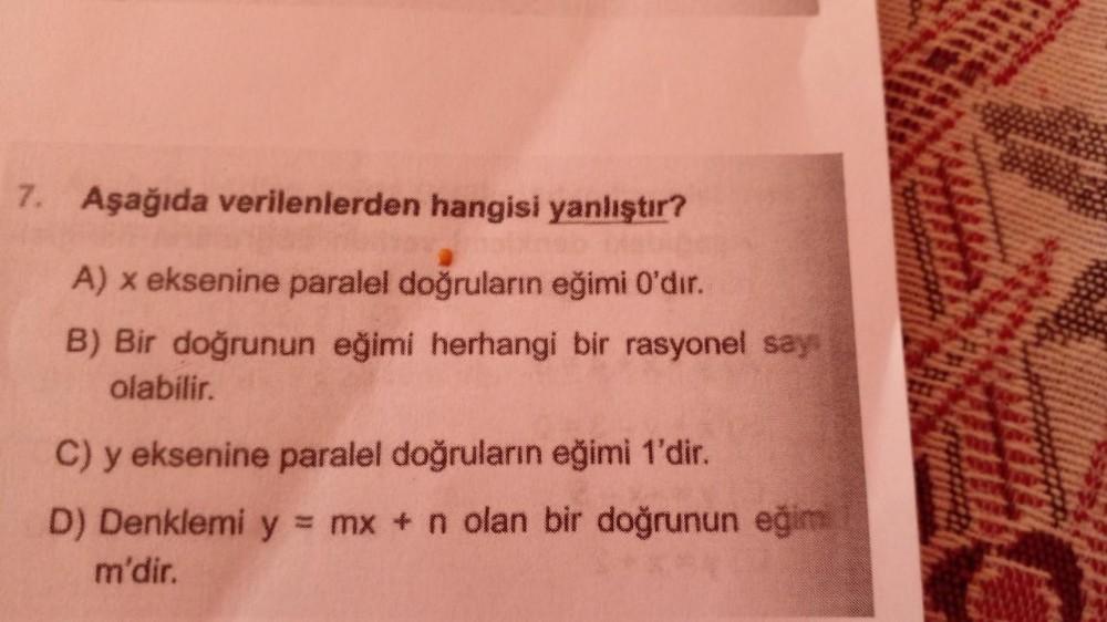 7. Aşağıda verilenlerden hangisi yanlıştır? A) x eksenine paralel doğruların eğimi O'dir. B) Bir doğrunun eğimi herhangi bir rasyonel say olabilir. C) y eksenine paralel doğruların eğimi 1'dir. D) Denklemi y = mx + n olan bir doğrunun eğim m'dir.