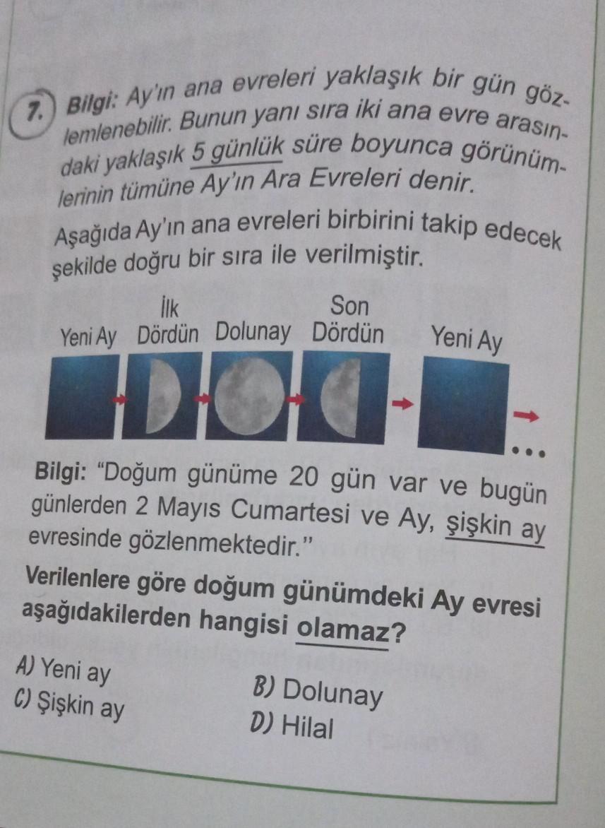 7.) Bilgi: Ay'ın ana evreleri yaklaşık bir gün göz- lemlenebilir. Bunun yanı sıra iki ana evre arasın- daki yaklaşık 5 günlük süre boyunca görünüm- lerinin tümüne Ay'ın Ara Evreleri denir. Aşağıda Ay'ın ana evreleri birbirini takip edecek şekilde doğru bir sıra ile verilmiştir. Son İlk Yeni Ay Dördün Dolunay Dördün DOC Bilgi: "Doğum günüme 20 gün var ve bugün günlerden 2 Mayıs Cumartesi ve Ay, şişkin ay evresinde gözlenmektedir." Yeni Ay Verilenlere göre doğum günümdeki Ay evresi aşağıdakilerden hangisi olamaz? A) Yeni ay C) Şişkin ay B) Dolunay D) Hilal