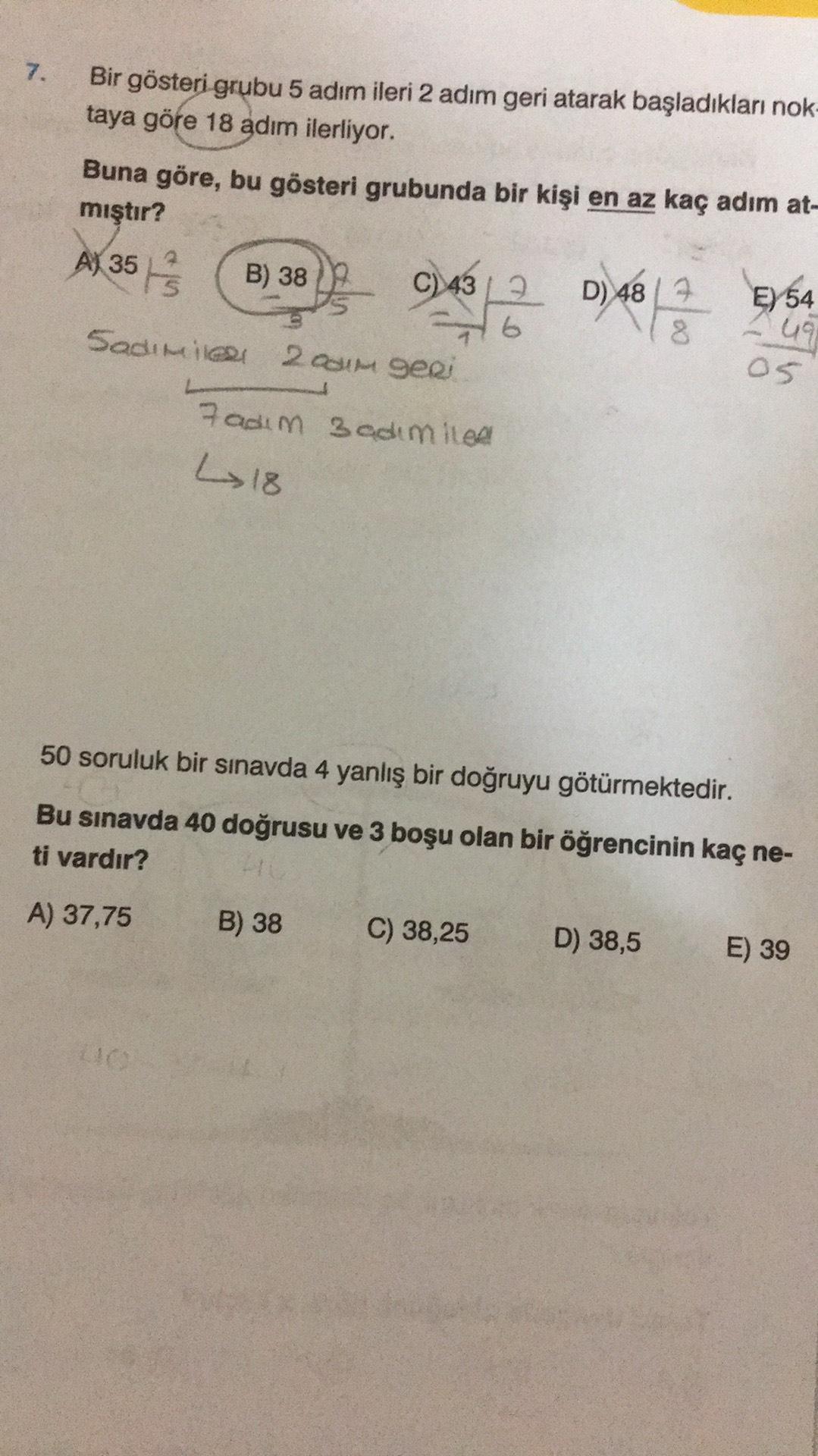 7. Bir gösteri grubu 5 adım ileri 2 adım geri atarak başladıkları nok- taya göre 18 adım ilerliyor. Buna göre, bu gösteri grubunda bir kişi en az kaç adım at- mıştır? A) 35 C) 439 T Sadimile 200m geri B) 38 7 adım 3 adım ile L> 18 B) 38 D) 484 8 50 soruluk bir sınavda 4 yanlış bir doğruyu götürmektedir. Bu sınavda 40 doğrusu ve 3 boşu olan bir öğrencinin kaç ne- ti vardır? 411 A) 37,75 C) 38,25 E 54 49 05 D) 38,5 E) 39