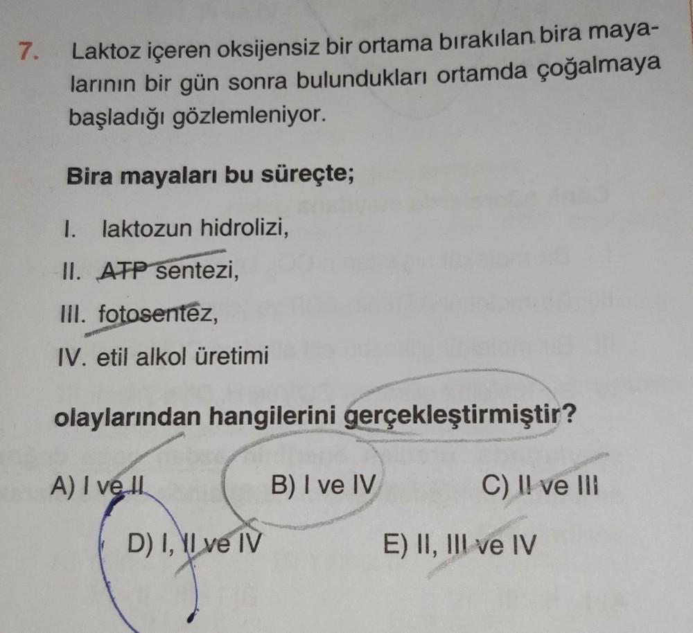 7. Laktoz içeren oksijensiz bir ortama bırakılan bira maya- larının bir gün sonra bulundukları ortamda çoğalmaya başladığı gözlemleniyor. Bira mayaları bu süreçte; 1. laktozun hidrolizi, II. ATP sentezi, III. fotosentez, IV. etil alkol üretimi olaylarından hangilerini gerçekleştirmiştir? A) I ve II B) I ve IV D) I, II ve IV C) II ve III E) II, III ve IV