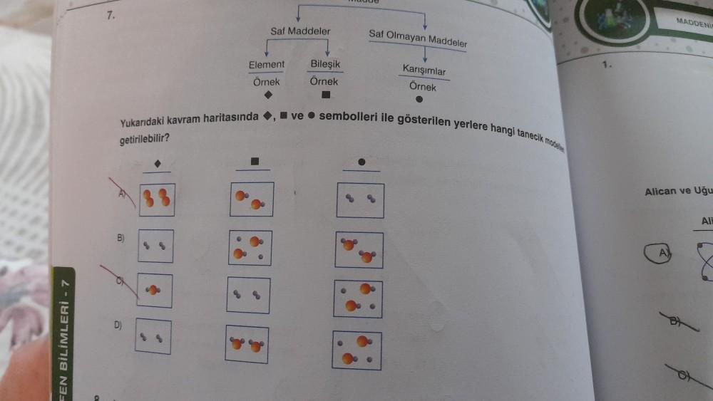 7. MADDEN Saf Maddeler Saf Olmayan Maddeler Element Ornek Bileşik Örnek Karışımlar Örnek Yukandaki kavram haritasında , ve sembolleri ile gösterilen yerlere hangi tanecik. getirilebilir? Alican ve Uğu 33 AL B) > 9 D) FEN BİLİMLERİ - 7