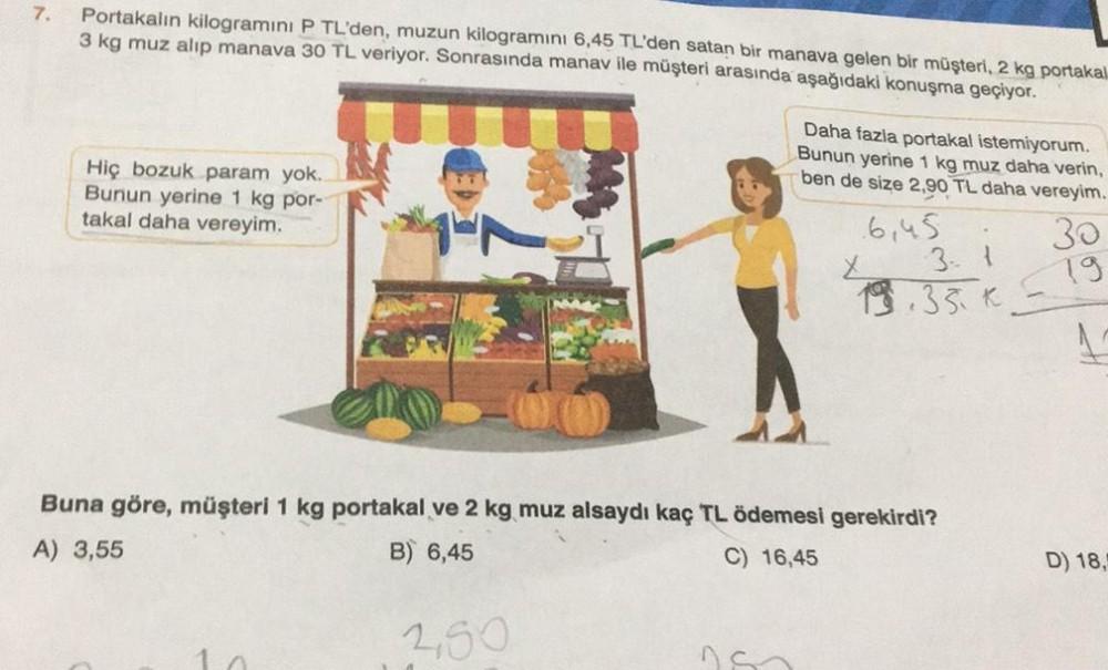 7. Portakalın kilogramını P TL'den, muzun kilogramını 6,45 TL'den satan bir manava gelen bir müşteri, 2 kg portakal 3 kg muz alıp manava 30 TL veriyor. Sonrasında manav ile müşteri arasında aşağıdaki konuşma geçiyor. Hiç bozuk param yok. Bunun yerine 1 kg por- takal daha vereyim. 10 Daha fazla portakal istemiyorum. Bunun yerine 1 kg muz daha verin, ben de size 2,90 TL daha vereyim. 6,45 Buna göre, müşteri 1 kg portakal ve 2 kg muz alsaydı kaç TL ödemesi gerekirdi? A) 3,55 B) 6,45 C) 16,45 250 3- 1 13.35 K 30 79 D) 18,5