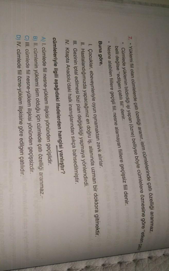 7. . Yüklemi fiil olan cümlelerde çatı özelliği aranır, isim cümlelerinde çatı özelliği aranmaz. Cümlede yüklemin bildirdiği işi yapan (özne) belliyse böyle cümlelere öznesine göre "etken calle belli değilse "edilgen çatılı fiil" denir. Nesne alabilen fiillere geçişli fiil, nesne alamayan fiillere geçişsiz fiil denir. Buna göre, 1. Çocuklar, ebeveynleriyle oyun oynamaktan zevk alırlar. II. Hastalandığımızda yapacağımız en doğru iş, alanında uzman bir doktora gitmektir. III. Gezinin iptal edilmesi bizi plan değişikliği yapmaya yönlendirdi. IV. Kitapta Anadolu'daki halk inanışlarından sıkça bahsedilmiştir. cümleleriyle ilgili aşağıdaki ifadelerden hangisi yanlıştır? A) I. cümlede fiil nesne-yüklem ilişkisi yönünden geçişlidir. B) II. cümlenin yüklemi isim olduğu için cümlede çatı özelliği aranmaz. C) III. cümlede fiil nesne-yüklem ilişkisi yönünden geçişsizdir. D) IV. cümlede fiil özne-yüklem ilişkisine göre edilgen çatılıdır.