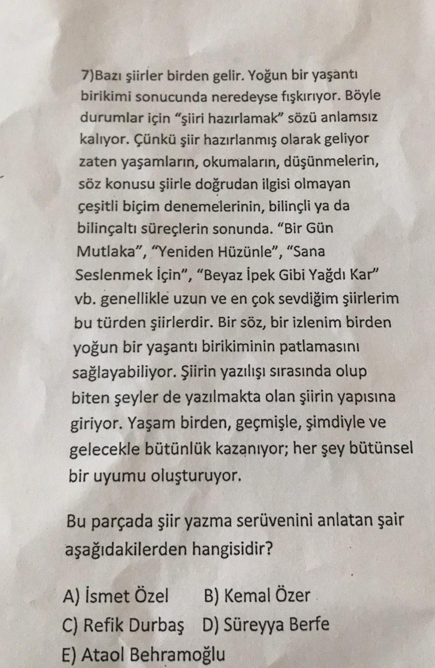 7)Bazı şiirler birden gelir. Yoğun bir yaşantı birikimi sonucunda neredeyse fışkırıyor. Böyle durumlar için “şiiri hazırlamak” sözü anlamsız kalıyor. Çünkü şiir hazırlanmış olarak geliyor zaten yaşamların, okumaların, düşünmelerin, söz konusu şiirle doğrudan ilgisi olmayan çeşitli biçim denemelerinin, bilinçli ya da bilinçaltı süreçlerin sonunda. "Bir Gün Mutlaka”, “Yeniden Hüzünle”, "Sana Seslenmek için”, “Beyaz İpek Gibi Yağdı Kar" vb. genellikle uzun ve en çok sevdiğim şiirlerim bu türden şiirlerdir. Bir söz, bir izlenim birden yoğun bir yaşantı birikiminin patlamasını sağlayabiliyor. Şiirin yazılışı sırasında olup biten şeyler de yazılmakta olan şiirin yapısına giriyor. Yaşam birden, geçmişle, şimdiyle ve gelecekle bütünlük kazanıyor; her şey bütünsel bir uyumu oluşturuyor. Bu parçada şiir yazma serüvenini anlatan şair aşağıdakilerden hangisidir? A) İsmet Özel B) Kemal Özer C) Refik Durbaş D) Süreyya Berfe E) Ataol Behramoğlu