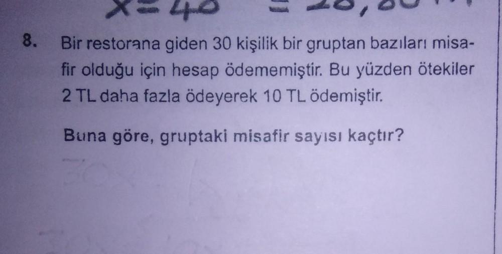 8. 4.0 Bir restorana giden 30 kişilik bir gruptan bazıları misa- fir olduğu için hesap ödememiştir. Bu yüzden ötekiler 2 TL daha fazla ödeyerek 10 TL ödemiştir. Buna göre, gruptaki misafir sayısı kaçtır?