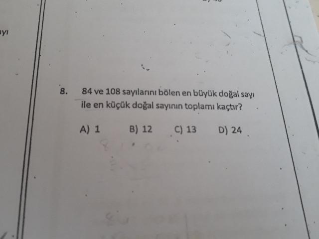 8. 84 ve 108 sayılarını bölen en büyük doğal sayı ile en küçük doğal sayının toplamı kaçtır? A) 1 B) 12 C) 13 D) 24