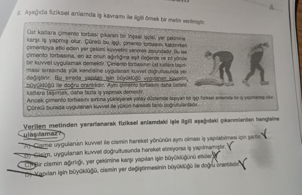 8. Aşağıda fiziksel anlamda iş kavramı ile ilgili örnek bir metin verilmiştir. Üst katlara çimento torbası çıkaran bir inşaat iş