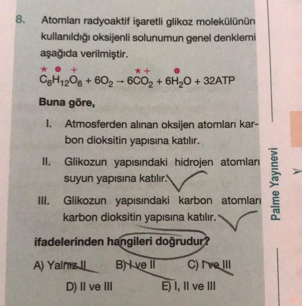 8. Atomları radyoaktif işaretli glikoz molekülünün kullanıldığı oksijenli solunumun genel denklemi aşağıda verilmiştir. C6H12O6 + 602 - 6CO2 + 6H2O + 32ATP Buna göre, 1. Atmosferden alınan oksijen atomları kar- bon dioksitin yapısına katılır. II. Glikozun yapısındaki hidrojen atomları suyun yapısına katılır. III. Glikozun yapısındaki karbon atomları karbon dioksitin yapısına katılır. Palme Yayınevi ifadelerinden hangileri doğrudur? A) Yalnizli BH ve II C) Ive III D) II ve III E) I, II ve III