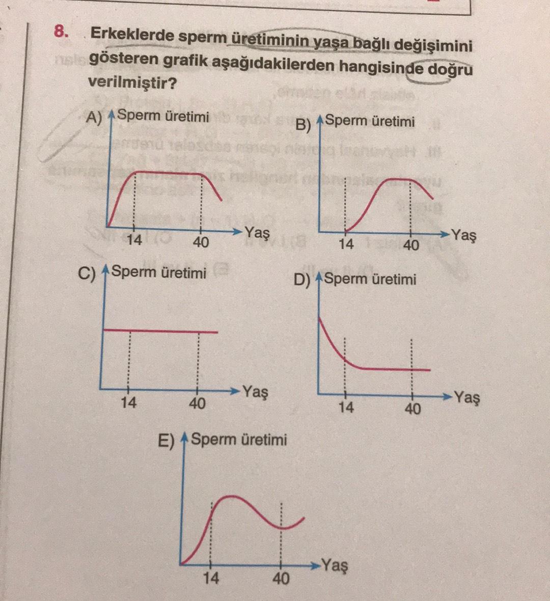 8. Erkeklerde sperm üretiminin yaşa bağlı değişimini nu gösteren grafik aşağıdakilerden hangisinde doğru verilmiştir? A) Sperm üretimi B) Sperm üretimi 14 Yaş → Yaş 40 14 40 C) Sperm üretimi D) Sperm üretimi Yaş 14 Yaş 40 14 40 E) Sperm üretimi 2 Yaş 14 40